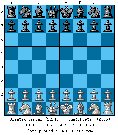 First move 2026 January 2 2:36:44 White clock - 29 days 19:13:07 Black clock - 30 days 00:00:00 [Event "FICGS__CHESS__RAPID_M__000179"] [Site "FICGS"] [Date "2026.01.02"] [Round "1"] [White "Swiatek,Janusz"] [Black "Faust,Dieter"] [Result "*"] [WhiteElo "2291"] [BlackElo "2156"] 1.* Follow this game move after move (download)You need not play well - just help your opponent to play badly. (Genrikh Chepukaitis) Ich verachte Kasparow. (Viktor Kortschnoi) Con o sin el título, Bobby Fischer fue sin lugar a dudas el mas grande jugador de su época. (Burt Hochberg) Le génie consiste à savoir transgresser les règles au moment opportun. (Teichmann) Lottery : A tax on people who are bad at math. (Author unknown)