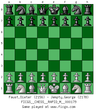 First move 2026 January 2 2:36:44 White clock - 29 days 18:32:58 Black clock - 30 days 00:00:00 [Event "FICGS__CHESS__RAPID_M__000179"] [Site "FICGS"] [Date "2026.01.02"] [Round "1"] [White "Faust,Dieter"] [Black "Jempty,George"] [Result "*"] [WhiteElo "2156"] [BlackElo "2178"] 1.* Follow this game move after move (download)Your body has to be in top condition. Your Chess deteriorates as your body does. You can't separate body from mind. (Bobby Fischer) Es gibt keine einzige Frau, der ich nicht einen Springer vorgeben könnte und trotzdem gewänne. (Robert James Fischer) Cuando tu no sabes absolutamente que mas hacer, es tiempo de entrar en pánico. (John van der Wiel) Les Cavaliers se révèlent fort utiles dans les positions fermées. D'habitude, les Fous sont un peu plus forts que les Cavaliers dans les positions ouvertes. Qu'on le veuille ou non, il restera toujours des exceptions ! Heh, heh, heh. Time to abandon ship. (General Grievous in Star Wars ep.3)