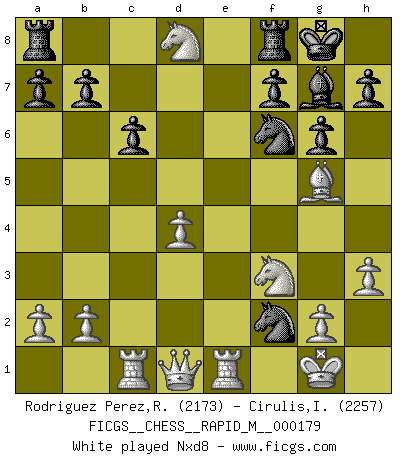 First move 2026 January 2 2:36:44 White clock - 29 days 18:14:14 Black clock - 30 days 00:00:00 [Event "FICGS__CHESS__RAPID_M__000179"] [Site "FICGS"] [Date "2026.01.02"] [Round "1"] [White "Rodriguez Perez,Rene"] [Black "Cirulis,Ilmars"] [Result "*"] [WhiteElo "2173"] [BlackElo "2257"] 1.* Follow this game move after move (download)Is Bobby Fischer quite sane ? (Salo Flohr) Über die Verhaftung Bobby Fischers: Warum es die Bush-Administration für nötig befindet einen 61 Jahre alten Mann zu hetzten, der für niemanden ausser sich selbste eine Gefahr darstellt ist ein Rätsel. (Nigel Short) El Ajedrez es en su esencia, un juego. En su forma, un arte. Y en su ejecución, una ciencia. (Baron Tassilo) Botvinnik disait en comparant les échecs à la musique: Il existe une science dont le but est l'étude de l'acoustique et des sons. Mais il y a aussi un art qui se sert de l'océan des sons : c'est la musique. De toute évidence, il en est de même pour la pensée. La logique est l'étude des lois de la réflexion et les échecs reflètent, en tant qu'art, le côté logique de la réflexion, sous la forme d'images artistiques... Extrait de Fischer - Spassky, Reykjavik 1972 par Alexander & F. Wyndham (Ed. Solar), p 37. Sometimes it pays to stay in bed in Monday, rather than spending the rest of the week debugging Monday's code. (Dan Salomon)
