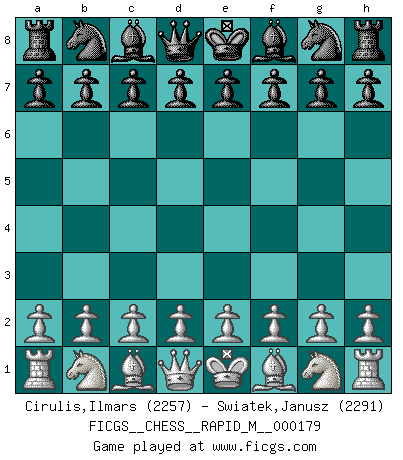First move 2026 January 2 2:36:44 White clock - 29 days 19:13:08 Black clock - 30 days 00:00:00 [Event "FICGS__CHESS__RAPID_M__000179"] [Site "FICGS"] [Date "2026.01.02"] [Round "1"] [White "Cirulis,Ilmars"] [Black "Swiatek,Janusz"] [Result "*"] [WhiteElo "2257"] [BlackElo "2291"] 1.* Follow this game move after move (download)No price is too great for the scalp of the enemy King. (Koblentz) Bogoljubow: Matt in vier Zügen! Tartakower: Ich verbitte mir jede Belästigung! (Savielly Grigorievitsch Tartakower) Aquel que ve no otra dirección en el juego que la de dar Jaque Mate a su oponente, nunca será un buen jugador de Ajedrez. (Euwe) La vérité est comme le meilleur coup aux échecs : elle existe, mais il faut la chercher. (Arturo Perez-Reverte) Opportunities multiply as they are seized. (Sun Tzu)