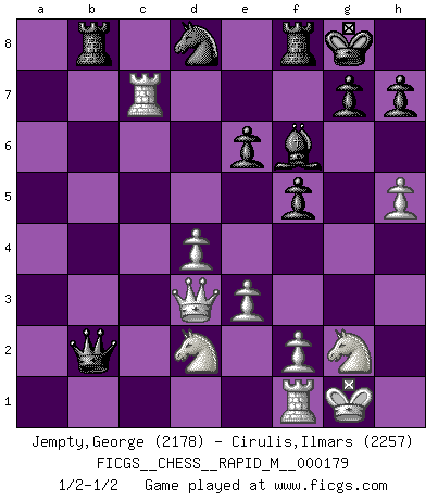 Last move : d4 2026 January 2 2:37:49 White clock - 30 days 23:58:55 Black clock - 29 days 18:15:20 [Event "FICGS__CHESS__RAPID_M__000179"] [Site "FICGS"] [Date "2026.01.02"] [Round "1"] [White "Jempty,George"] [Black "Cirulis,Ilmars"] [Result "*"] [WhiteElo "2178"] [BlackElo "2257"] 1.d4 * Follow this game move after move (download)All I want to do, ever, is just play Chess. (Bobby Fischer) Als er Schachweltmeister wurde ließ er praktisch alle stärksten Sovietspieler für sich arbeiten. Wenn ein auch nur mittelmässiger Meister ein Spezialist für eine bestimmte Eröffnung war, wurde er von Karpov gerufen. Das wurde alles geheim gehalten. (Mikhail Moiseyevich Botvinik) El Ajedrez es un cuento de Hadas de las 1001 metidas de pata. (Savielly Tartakower) Nous sommes les pions de la mystérieuse partie d'Echecs jouée par Dieu. Il nous déplace, nous arrête, nous pousse encore, puis nous lance un à un dans la boîte du Néant. Epitaphe sur la tombe de David Janowsky (1868-1927). Don't anthropomorphize computers - they hate it. (Anonymous)
