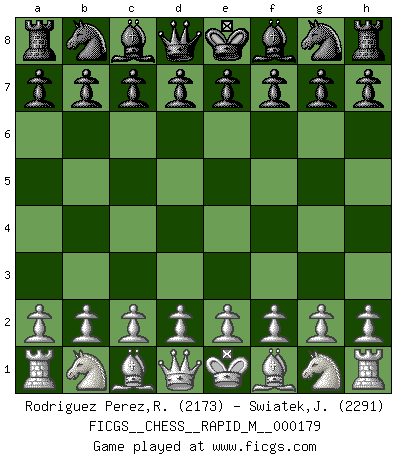 First move 2026 January 2 2:36:44 White clock - 29 days 19:13:06 Black clock - 30 days 00:00:00 [Event "FICGS__CHESS__RAPID_M__000179"] [Site "FICGS"] [Date "2026.01.02"] [Round "1"] [White "Rodriguez Perez,Rene"] [Black "Swiatek,Janusz"] [Result "*"] [WhiteElo "2173"] [BlackElo "2291"] 1.* Follow this game move after move (download)Avoid the crowd. Do your own thinking independently. Be the Chess player, not the Chess piece. (Ralph Charell) Eine Person mit durchschnittlichem IQ kann etwa eine ELO von 2000 erreichen. (Jonathan Levitt) Siempre es mejor sacrificar los hombres de tu oponente. (Savielly Tartakower) Le plus grand jeu de l'esprit jamais inventé, plus vous l'apprenez, plus vous y prenez du plaisir. (Garry Kasparov) It is the aim of the modern school, not to treat every position according to one general law, but according to the principle inherent in the position. (Richard Reti)