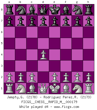 Last move : d4 2026 January 2 2:37:23 White clock - 30 days 23:59:21 Black clock - 29 days 17:28:30 [Event "FICGS__CHESS__RAPID_M__000179"] [Site "FICGS"] [Date "2026.01.02"] [Round "1"] [White "Jempty,George"] [Black "Rodriguez Perez,Rene"] [Result "*"] [WhiteElo "2178"] [BlackElo "2173"] 1.d4 * Follow this game move after move (download)Fischer is under obligation to nobody. (Joseph Platz) Woher wissen wir, daß der Neanderthaler Blindschach gespielt hat? -- Bei Ausgrabungen wurden keine Schachbretter und Figuren gefunden. (Anonymous) No es una movida, aún la mejor movida que tu debas buscar, sino un plan comprensible. (Eugene Znosko-Borovsky) Fischer est le meilleur joueur du monde et Karpov n'est qu'un joueur de bistrot. (Garry Kasparov, agé de 16 ans) I think your argument is specious - I think your tie is ugly. (Gregory House to Dr. Foreman, House M.D.)