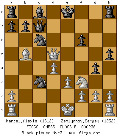 Last move : Nxc3 2026 January 7 18:3:3 White clock - 78 days 00:52:03 (59 days 06:47:14) Black clock - 76 days 14:29:08 [Event "FICGS__CHESS__CLASS_F__000238"] [Site "FICGS"] [Date "2026.01.03"] [Round "1"] [White "Marcel,Alexis"] [Black "Zemlyanov,Sergey"] [Result "*"] [WhiteElo "1612"] [BlackElo "1252"] 1.d4 Nf6 2.c4 e6 3.Nc3 Bb4 4.Nf3 d5 5.cxd5 exd5 6.Bf4 Ne4 7.Qb3 Nc6 8.e3 g5 9.Bg3 h5 10.Be5 f6 11.Bb5 Bxc3+ 12.bxc3 g4 13.Bxc7 Qxc7 14.Qxd5 Nxc3 15.* Follow this game move after move (download)I play correspondence chess because it is both art and science while chess is art only. (A player at FICGS) Ich würde die 30 stärksten Spieler der USA im Simultanspiel besiegen. (José Raúl Capablanca) Combinaciones deslumbrantes son para la mayoría, mover madera es para los pocos. (Georg Kieninger) Les échecs c'est le défi de l'alpiniste, toujours plus haut, prêt à tout pour monter à l'assaut du Roi ennemi. Les échecs, c'est de la musique en mouvement, un ballet majestueux pour les yeux. C'est de la poésie composée par les fantômes du passé qui au même titre que Rimbaud ou Verlaine méritent notre admiration. Les échecs, c'est de la peinture ou le moindre mouvement modifie le tableau pour en faire un Picasso ou un Van Gogh. Les échecs, c'est tout et rien, c'est la vie et la mort. Jjulie33 sur le forum de France-Echecs. Don't be irreplaceable, if you can't be replaced, you can't be promoted. (Dan Rotaru)