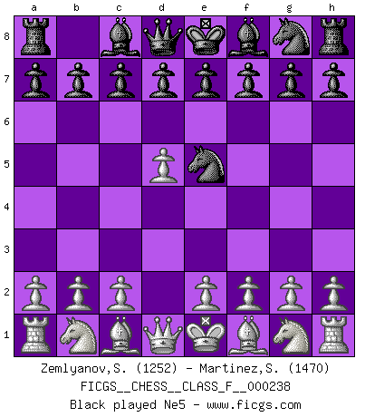 Last move : d5 2026 January 7 18:3:36 White clock - 38 days 19:16:05 Black clock - 35 days 20:05:07 [Event "FICGS__CHESS__CLASS_F__000238"] [Site "FICGS"] [Date "2026.01.03"] [Round "1"] [White "Zemlyanov,Sergey"] [Black "Martinez,Silvio"] [Result "*"] [WhiteElo "1252"] [BlackElo "1470"] 1.d4 Nc6 2.d5 * Follow this game move after move (download)Nowadays, when you're not a grandmaster at 14, you can forget about it. (Anand Viswanathan) Wenn Spassky eine Figur opfert kannst du genauso gut aufgeben. Aber wenn Tal eine Figur opfert, spiel weiter. Er könnte noch eine weitere opfern, und dann ... wer weiß? (Miguel Najdorf) En la perfecta combinación de Ajedrez como en una historia corta de primera clase, toda la trama y contra trama deberá conducir hacia un final sorprendente, el interes no es mitigado hasta el último momento. (Yates and Winter) Les Cavaliers se révèlent fort utiles dans les positions fermées. D'habitude, les Fous sont un peu plus forts que les Cavaliers dans les positions ouvertes. Qu'on le veuille ou non, il restera toujours des exceptions ! There will be no order, only chaos. (Sol Robeson in Pi by Darren Aronofsky)