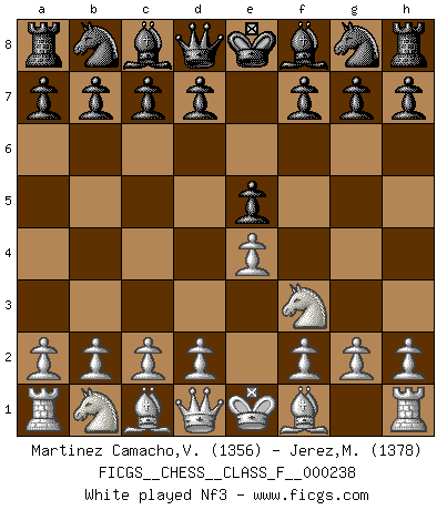 Last move : e4 2026 January 3 3:18:37 White clock - 39 days 23:18:23 Black clock - 36 days 04:40:08 [Event "FICGS__CHESS__CLASS_F__000238"] [Site "FICGS"] [Date "2026.01.03"] [Round "1"] [White "Martinez Camacho,Victor Hugo"] [Black "Jerez,Miriam"] [Result "*"] [WhiteElo "1356"] [BlackElo "1378"] 1.e4 * Follow this game move after move (download)Fischer sacrificed virtually everything most of us weakies (to use his term) value, respect, and cherish, for the sake of an artful, often beautiful board game, for the ambivalent privilege of being its greatest master. (Paul Kollar) Schach verlangt totale Konzentration. (Robert James Fischer) Siempre es mejor sacrificar los hombres de tu oponente. (Savielly Tartakower) La vérité est comme le meilleur coup aux échecs : elle existe, mais il faut la chercher. (Arturo Perez-Reverte) When you stop learning you start dying. (Scott Adams)