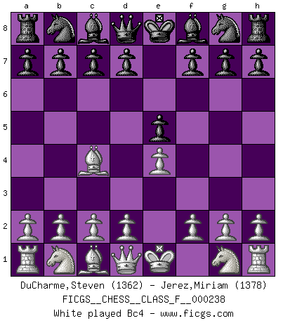 Last move : e4 2026 January 3 19:42:10 White clock - 39 days 06:54:50 Black clock - 36 days 21:03:41 [Event "FICGS__CHESS__CLASS_F__000238"] [Site "FICGS"] [Date "2026.01.03"] [Round "1"] [White "DuCharme,Steven"] [Black "Jerez,Miriam"] [Result "*"] [WhiteElo "1362"] [BlackElo "1378"] 1.e4 * Follow this game move after move (download)Man is a frivolous, a specious creature, and like a Chess player, cares more for the process of attaining his goal than for the goal itself. (Dostoyevsky) Es macht mich traurig, wenn ich sehe, dass Golfprofis mehr verdienen als Schachsportler. Obwohl ich davon überzeugt bin, dass wir Schachspieler viel härter trainieren müssen als die Golfer. (Alexandra Kosteniuk) El sobresalir en el Ajedrez es un signo de una mente intrigante. (Sir Arthur Conan Doyle) Il vaut mieux sacrifier les pièces de l'adversaire. (Xavier Tartacover) Coffee just isn't my cup of tea. (Unknown)