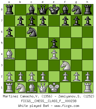 Last move : a6 2026 January 7 18:4:2 White clock - 36 days 04:45:26 Black clock - 38 days 11:47:33 [Event "FICGS__CHESS__CLASS_F__000238"] [Site "FICGS"] [Date "2026.01.03"] [Round "1"] [White "Martinez Camacho,Victor Hugo"] [Black "Zemlyanov,Sergey"] [Result "*"] [WhiteElo "1356"] [BlackElo "1252"] 1.e4 e5 2.Nf3 Nc6 3.Bb5 a6 4.* Follow this game move after move (download)Blessed be the memory of him who gave the world this immortal game. (A. G. Gardiner) Ich hatte meine größten Erfolge, als ich 47 Jahre alt war. Kasparow war noch nicht mal 42 und hat das Schach schon im Stich gelassen. (Viktor Kortschnoi) Con o sin el título, Bobby Fischer fue sin lugar a dudas el mas grande jugador de su época. (Burt Hochberg) Si je n'étais pas joueur d'échecs, je serais le meilleur dans quelque chose d'autre. (Anatoli Karpov) That's absurd. I love it. (Gregory House, House M.D.)