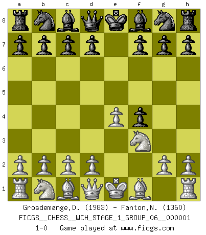 Last move : 1-0 2006 August 12 5:28:26 [Event "FICGS__CHESS__WCH_STAGE_1_GROUP_06__000001"] [Site "FICGS"] [Date "2006.07.01"] [Round "1"] [White "Grosdemange,David"] [Black "Fanton,Nicolas"] [Result "1-0"] [WhiteElo "1983"] [BlackElo "1360"] 1.e4 e5 2.f4 exf4 3.Nf3 1-0 This chess game has been lost on time (started : 2006.07.01 16:7:34) King's knight's gambit Player White won this chess game. Follow this game move after move (download)Some part of a mistake is always correct. (Savielly Tartakover) Schach ist Kampf, hauptsächlich jedoch gegen die eigenen Fehler. (Savielly Grigorievitsch Tartakower) Los Peones son el alma de una partida de Ajedrez. (Francois Andre Danican Philidor) Les Echecs sont et restent toujours un combat, un combat intégral comme la boxe, la lutte ou un autre sport, et où il doit y avoir un vainqueur et un vaincu. (Joseph Emil Diemer) A clear conscience is usually the sign of a bad memory. (Unknown)
