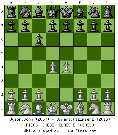 Last move : d4 2026 January 6 22:10:24 White clock - 38 days 19:08:35 Black clock - 37 days 22:11:02 [Event "FICGS__CHESS__CLASS_B__000390"] [Site "FICGS"] [Date "2026.01.04"] [Round "1"] [White "Dyson,John"] [Black "Suwara,Kazimierz"] [Result "*"] [WhiteElo "2057"] [BlackElo "2015"] 1.e4 c6 2.d4 * Follow this game move after move (download)For surely of all the drugs in the world, Chess must be the most permanently pleasurable. (Assiac) Zum Sieg gelangt man nicht, wenn man gut, sondern nur wenn man besser spielt (Savielly Grigorievitsch Tartakower) Si pudieramos observar el interior de la cabeza de un jugador de Ajedrez, encontraríamos ahí un mundo lleno de sentimientos, imágenes, ideas, emoción y pasión. (Alfred Binet) Le thème de l'attaque double intervient d'une manière ou d'une autre dans l'immense majorité des combinaisons. (Youri Averbakh) A proverb is a short sentence based on long experience. (Miguel de Cervantes)