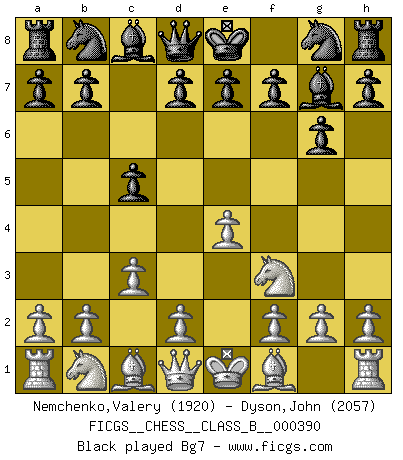 Last move : c3 2026 January 7 17:29:25 White clock - 38 days 11:05:17 Black clock - 38 days 06:14:20 [Event "FICGS__CHESS__CLASS_B__000390"] [Site "FICGS"] [Date "2026.01.04"] [Round "1"] [White "Nemchenko,Valery"] [Black "Dyson,John"] [Result "*"] [WhiteElo "1920"] [BlackElo "2057"] 1.e4 c5 2.Nf3 g6 3.c3 * Follow this game move after move (download)Different people feel differently about resigning. (Bobby Fischer) Als er Schachweltmeister wurde ließ er praktisch alle stärksten Sovietspieler für sich arbeiten. Wenn ein auch nur mittelmässiger Meister ein Spezialist für eine bestimmte Eröffnung war, wurde er von Karpov gerufen. Das wurde alles geheim gehalten. (Mikhail Moiseyevich Botvinik) Cuando tu casa esta en llamas, no puedes ser molestado por tus vecinos. O, como decinos en Ajedrez, si tu Rey esta bajo ataque, no te preocupa perder un Peón del lado de la Reina. (Gary Kasparov) La solitude du joueur d'Echecs à l'approche du mat est semblable à celle du condamné. (Francis Szpiner) If you lose the game you should win the analysis! (Proverb)