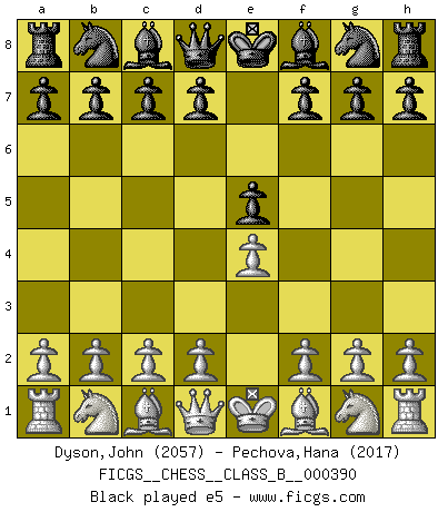 Last move : e4 2026 January 5 15:17:24 White clock - 39 days 04:19:07 Black clock - 38 days 13:00:31 [Event "FICGS__CHESS__CLASS_B__000390"] [Site "FICGS"] [Date "2026.01.04"] [Round "1"] [White "Dyson,John"] [Black "Pechova,Hana"] [Result "*"] [WhiteElo "2057"] [BlackElo "2017"] 1.e4 * Follow this game move after move (download)If a ruler does not understand Chess, how can he rule over a kingdom ? (King Khusros II) Stelle das Brett so, daß die Sonne in die Augen deines Gegners scheint. (Ruy López) Yo tuve un dolor de muelas en la primer partida. En el segundo juego, tuve un dolor de cabeza. En el tercero, tuve un ataque de reumatísmo. En la cuarta partida, no me sentía muy bien. ¿Y en el quinto juego? Bueno, ¿que acaso uno tiene que ganar todos los juegos?. (Siegbert Tarrasch) D'abord les bases : Jouez et étudiez, puis étudiez et jouez, ensuite jouez et étudiez, puis étudiez et jouez. Deuxièmement : Donnez toujours le meilleur de vous-même ! (Ken Smith) I know the human being and fish can coexist peacefully. (George W. Bush, Saginaw sept. 29, 2000)