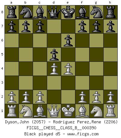 Last move : d4 2026 January 6 22:6:57 White clock - 38 days 15:05:36 Black clock - 38 days 16:45:11 [Event "FICGS__CHESS__CLASS_B__000390"] [Site "FICGS"] [Date "2026.01.04"] [Round "1"] [White "Dyson,John"] [Black "Rodriguez Perez,Rene"] [Result "*"] [WhiteElo "2057"] [BlackElo "2206"] 1.e4 e6 2.d4 * Follow this game move after move (download)Spassky will not be psyched out by Fischer. (Mike Goodall) Computer sind die einzigen Gegner, die nicht immer eine Ausrede auf Lager haben, wenn sie gegen mich verlieren. (Robert James Fischer) Fischer es una tragedia del Ajedrez Americano a la par con Morphy y Pillsbury. (Mig Greengard) J'ai toujours senti une vague pitié pour l'homme qui ne connaît rien aux échecs, tout comme j'en aurais pour un homme ignorant de l'amour. Les Echecs, comme la musique ou comme l'amour, ont le pouvoir de rendre heureux. (Siegbert Tarrasch) Chess is everything: art, science and sport. (Anatoly Karpov)