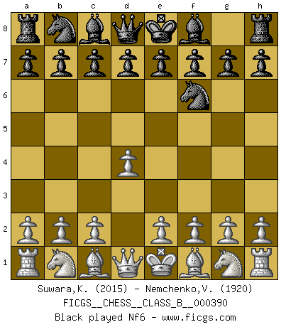 Last move : Nf6 2026 January 6 19:25:52 White clock - 37 days 14:16:56 Black clock - 39 days 17:33:52 [Event "FICGS__CHESS__CLASS_B__000390"] [Site "FICGS"] [Date "2026.01.04"] [Round "1"] [White "Suwara,Kazimierz"] [Black "Nemchenko,Valery"] [Result "*"] [WhiteElo "2015"] [BlackElo "1920"] 1.d4 Nf6 2.* Follow this game move after move (download)Even the laziest King flees wildly in the face of a double check ! (Aaron Nimzowitsch) Je älter ich werde, um so mehr schätze ich die Bauern. (Paul Keres) Una buena ofensiva y una buena defensa, comienzan ambas con un buen desarrollo. (Bruce A. Moon) Le génie consiste à savoir transgresser les règles au moment opportun. (Teichmann) It's unlucky to be superstitious. (Dave Enteles)