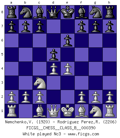 Last move : d4 2026 January 6 19:25:59 White clock - 38 days 13:40:23 Black clock - 38 days 17:59:47 [Event "FICGS__CHESS__CLASS_B__000390"] [Site "FICGS"] [Date "2026.01.04"] [Round "1"] [White "Nemchenko,Valery"] [Black "Rodriguez Perez,Rene"] [Result "*"] [WhiteElo "1920"] [BlackElo "2206"] 1.e4 e6 2.d4 * Follow this game move after move (download)When you are lonely, when you feel yourself an alien in the world, play Chess. This will raise your spirits and be your counselor in war. (Aristotle) Alles was am Schachbrett zählt sind gute Züge. (Robert James Fischer) Tu no necesitas jugar muy bien, únicamente ayudar a tu oponenet a que juegue muy mal. (Genrikh Chepukaitis) Les Echecs mettent en conflit, non pas deux intelligences, mais deux volontés. (Lasker) If we knew what we were doing, we would not call it research. (Albert Einstein)