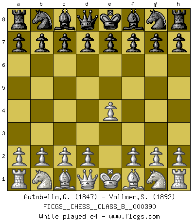 Last move : e4 2026 January 4 19:37:9 Steve Vollmer ... is in vacation until 2026 January 10 10:37:8 White clock - 39 days 23:59:22 Black clock - 40 days 00:00:00 [Event "FICGS__CHESS__CLASS_B__000390"] [Site "FICGS"] [Date "2026.01.04"] [Round "1"] [White "Autobello,Giovanni"] [Black "Vollmer,Steve"] [Result "*"] [WhiteElo "1847"] [BlackElo "1892"] 1.e4 * Follow this game move after move (download)My God, Bobby Fischer plays so simply. (Alexei Suetin) Ich glaube, ich kenne inzwischen die Gründe für mein Versagen: schachliche Charakterfehler. Ich war nie ein Wunderkind und in meiner gesamten menschlichen Entwicklung immer zu langsam. (Viktor Kortschnoi) Fischer es el jugador mas fuerte del mundo. De hecho, el jugador mas fuerte que jamas haya existido. (Larry Evans) Dieu déplace le joueur, et celui-ci la pièce. Quel Dieu derrière Dieu commence donc la trame ? Arturo Perez-Reverte (prix de littérature policière 1993). Life doesn't imitate art, it imitates bad television. (Woody Allen)
