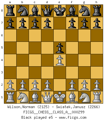 Last move : e4 2026 January 8 11:54:21 White clock - 39 days 23:54:38 Black clock - 38 days 16:10:40 [Event "FICGS__CHESS__CLASS_A__000299"] [Site "FICGS"] [Date "2026.01.08"] [Round "1"] [White "Wilson,Norman"] [Black "Swiatek,Janusz"] [Result "*"] [WhiteElo "2125"] [BlackElo "2266"] 1.e4 * Follow this game move after move (download)Is Bobby Fischer quite sane ? (Salo Flohr) Es liegt in der Natur, vernüftig zu denken und unlogisch zu handeln. (Anatole France) La mitad de las variaciones que son calculadas en una partida de torneo, resultan ser completamente superfluas. Desafortunadamente, nadie sabe por adelantado cual mitad. (Jan Tinman) Karpov est une pièce de musée. (Garry Kasparov) Everything in life is luck. (Donald Trump)