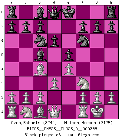 Last move : d6 2026 January 9 10:41:6 White clock - 38 days 10:47:15 Black clock - 39 days 20:10:06 [Event "FICGS__CHESS__CLASS_A__000299"] [Site "FICGS"] [Date "2026.01.08"] [Round "1"] [White "Ozen,Bahadir"] [Black "Wilson,Norman"] [Result "*"] [WhiteElo "2244"] [BlackElo "2125"] 1.e4 e5 2.Nf3 Nc6 3.Bc4 Nf6 4.d3 Bc5 5.O-O d6 6.* Follow this game move after move (download)Excellence at Chess is one mark of a scheming mind. (Sir Arthur Conan Doyle) Der Partner hat auch seine Existenzberechtigung. (Savielly Grigorievitsch Tartakower) El Ajedrez es un mar en el cual un mosquito puede beber y un elefante puede bañarse. (Refrán Hindú) Je menace de comprendre la position. (Anonyme) Perhaps the current trend of many chess professionals taking up the more lucrative pastime of poker is not a wholly negative one. It may not be too late for humans to relearn how to take risks in order to innovate and thereby maintain the advanced lifestyles we enjoy. And if it takes a poker-playing supercomputer to remind us that we can't enjoy the rewards without taking the risks, so be it. (The Chess Master and the Computer, by Garry Kasparov - 2010)