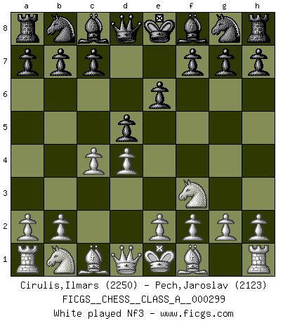 Last move : Nf3 2026 January 8 18:17:19 White clock - 39 days 22:00:55 Black clock - 38 days 09:42:42 [Event "FICGS__CHESS__CLASS_A__000299"] [Site "FICGS"] [Date "2026.01.08"] [Round "1"] [White "Cirulis,Ilmars"] [Black "Pech,Jaroslav"] [Result "*"] [WhiteElo "2250"] [BlackElo "2123"] 1.d4 d5 2.c4 e6 3.Nf3 * Follow this game move after move (download)I'm not a materialistic person, in that, I don't suffer the lack or loss of money. The absence of worldly goods I don't look back on. For Chess is a way I can be as materialistic as I want without having to sell my soul. (Jamie Walter Adams) Ein guter Spieler hat immer Glück. (José Raúl Capablanca) No es suficiente ser un buen jugador, se debe también de jugar bién. (Siegbert Tarrasch) Demandez au pauvre Cg1 ce qu'il en pense. Eduard Gufeld à propos de la variante Saemisch de l'Est-Indienne. Wisdom doesn't necessarily come with age. Sometimes age just shows up all by itself. (Tom Watson)