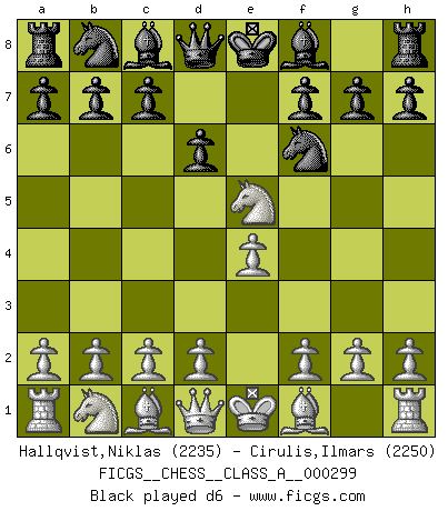 Last move : d6 2026 January 8 15:31:11 White clock - 38 days 23:08:36 Black clock - 39 days 22:04:20 [Event "FICGS__CHESS__CLASS_A__000299"] [Site "FICGS"] [Date "2026.01.08"] [Round "1"] [White "Hallqvist,Niklas"] [Black "Cirulis,Ilmars"] [Result "*"] [WhiteElo "2235"] [BlackElo "2250"] 1.e4 e5 2.Nf3 Nf6 3.Nxe5 d6 4.* Follow this game move after move (download)Let the perfectionist play postal. (Yasser Seirawan) Es gibt zwei Arten von Opfern: Korrekte und meine. (Mikhail Nekhemyevich Tal) Con el fin de mejorar tu juego, debes de estudiar los finales antes que todo, ya que mientras que los finales pueden ser estudiados y dominados por sí mismos, el juegomedio y la apertura deben de ser estudiados en relación con los finales. (José Raúl Capablanca) Les réformistes prétendent que les progrès de la théorie conduiront à la disparition des échecs, et qu'il faut, pour leur rendre vie, en remanier les règles. En réalité, qu'exprime cette affirmation? Le mépris de l'intuition, de l'imagination et de tous les autres éléments qui font des échecs un art. (Alexander Alekhine) Real knowledge is to know the extent of one's ignorance. (Confucius)