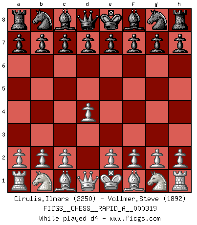 Last move : d4 2026 January 15 10:29:15 White clock - 30 days 15:02:19 Black clock - 29 days 19:43:31 [Event "FICGS__CHESS__RAPID_A__000319"] [Site "FICGS"] [Date "2026.01.15"] [Round "1"] [White "Cirulis,Ilmars"] [Black "Vollmer,Steve"] [Result "*"] [WhiteElo "2250"] [BlackElo "1892"] 1.d4 * Follow this game move after move (download)All I want to do, ever, is just play Chess. (Bobby Fischer) Schach ist das Spiel, das die Verrückten gesund hält. (Albert Einstein) Los finales de Peón son del Ajedrez lo que el cesped es del Golf. (Cecil Purdy) Toute estimation doit être constamment réévaluée. (Jacob Estrin) Yoga is 99% practice and 1% knowledge. (Sri Krishna Pattabhi Jois)