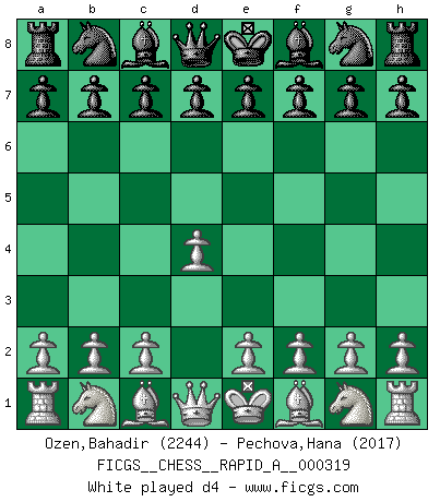 Last move : d4 2026 January 15 8:33:44 White clock - 30 days 16:57:50 Black clock - 29 days 17:26:43 [Event "FICGS__CHESS__RAPID_A__000319"] [Site "FICGS"] [Date "2026.01.15"] [Round "1"] [White "Ozen,Bahadir"] [Black "Pechova,Hana"] [Result "*"] [WhiteElo "2244"] [BlackElo "2017"] 1.d4 * Follow this game move after move (download)I am still a victim of Chess. It has all the beauty of art and much more. It cannot be commercialized. Chess is much purer than art in its social position. (Marcel Duchamp) Ich glaube, ich kenne inzwischen die Gründe für mein Versagen: schachliche Charakterfehler. Ich war nie ein Wunderkind und in meiner gesamten menschlichen Entwicklung immer zu langsam. (Viktor Kortschnoi) Yo no le temo a Spassky. Todos saben que yo soy el mejor. Uno no necesita un torneo para probarlo. (Bobby Fischer) La victoire dans une partie d'Echecs appartient la plupart du temps à celui qui voit un peu plus loin que l'adversaire. (Lasker) For a mechanic, you seem to do an excessive amount of thinking. (C-3PO in Star Wars ep.2)