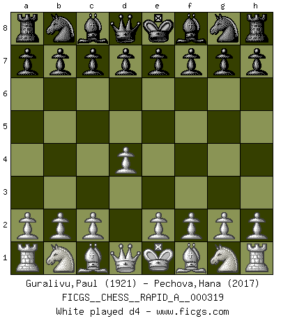 Last move : d4 2026 January 15 10:0:43 White clock - 30 days 15:30:51 Black clock - 29 days 20:44:52 [Event "FICGS__CHESS__RAPID_A__000319"] [Site "FICGS"] [Date "2026.01.15"] [Round "1"] [White "Guralivu,Paul"] [Black "Pechova,Hana"] [Result "*"] [WhiteElo "1921"] [BlackElo "2017"] 1.d4 * Follow this game move after move (download)It is not a move, even the best move that you must seek, but a realizable plan. (Eugene Znosko-Borovsky) Jeder Schachmeister war einmal ein Anfänger. (Irving Chernev) Cuando la partida de Ajedrez termina, el Peón y el Rey regresan a la misma caja. (Irish saying) La menace est plus forte que l'exécution. (Aaron Nimzovitch) An expert is a man who has made all the mistakes which can be made in a very narrow field. (Niels Bohr)