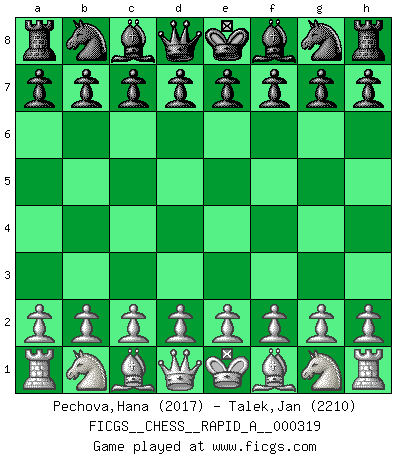 First move 2026 January 15 1:31:34 White clock - 29 days 13:56:13 Black clock - 30 days 00:00:00 [Event "FICGS__CHESS__RAPID_A__000319"] [Site "FICGS"] [Date "2026.01.15"] [Round "1"] [White "Pechova,Hana"] [Black "Talek,Jan"] [Result "*"] [WhiteElo "2017"] [BlackElo "2210"] 1.* Follow this game move after move (download)When asked, -How is that you pick better moves than your opponents?, I responded: I'm very glad you asked me that, because, as it happens, there is a very simple answer. I think up my own moves, and I make my opponent think up his. (Alexander Alekhine) Sehr viele beherrschen heutzutage das große Einmalseins des Schachspiels und kennen sogar dessen Logarithmentafeln auswendig - deshalb sollte man hin und wieder zu beweisen trachten, dass zwei mal zwei auch fünf sein kann. (Mikhail Nekhemyevich Tal) Al jugar al Ajedrez entonces, podemos aprender: Primero: Previsión... Segundo: Prudencia... Tercero: Cautela... Y al final, aprendemos del Ajedrez el hábito de no ser desanimados por apariencias malas presentes en el estado de nuestros asuntos, el hábito de la esperanza por una oportunidad favorable y la perseveración de los secretos de los recursos. (Benjamin Franklin) A ce moment-là, je menaçais de comprendre la position ! (Clément L'Heureux) Happy endings are just stories that haven't finished yet. (Jane Smith in Mr & Mrs Smith)