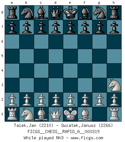 Last move : Nh3 2026 January 15 1:32:47 White clock - 30 days 23:58:47 Black clock - 29 days 13:53:19 [Event "FICGS__CHESS__RAPID_A__000319"] [Site "FICGS"] [Date "2026.01.15"] [Round "1"] [White "Talek,Jan"] [Black "Swiatek,Janusz"] [Result "*"] [WhiteElo "2210"] [BlackElo "2266"] 1.Nh3 * Follow this game move after move (download)Blessed be the memory of him who gave the world this immortal game. (A. G. Gardiner) Wenn man heute mit 14 Jahren noch kein GM ist, kann man es vergessen. (Viswanathan Anand) Te sientas frente a un tablero y repentinamente tu corazón brinca. Tu mano tiembla al tomar una pieza y moverla. Pero lo que el Ajedrez te enseña es que tu debes permanecer ahí con calma y pensar de que si realmente es una buena idea o de que si hay otras ideas mejores. (Stanley Kubrick) Nous vivons dans un monde échiquéen : chaque jour qui passe est un défi à relever. (Philosophe Sasha) Tomorrow's what you make of it. (Horatio Caine, C.S.I. Miami)