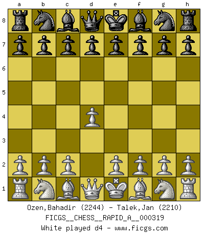 Last move : d4 2026 January 15 8:33:34 White clock - 30 days 16:58:00 Black clock - 29 days 21:01:47 [Event "FICGS__CHESS__RAPID_A__000319"] [Site "FICGS"] [Date "2026.01.15"] [Round "1"] [White "Ozen,Bahadir"] [Black "Talek,Jan"] [Result "*"] [WhiteElo "2244"] [BlackElo "2210"] 1.d4 * Follow this game move after move (download)Pawns: they are the soul of this game, they alone form the attack and defense. (Philidor) Ich suche im Schach immer etwas Eigenes. Riskantes Spiel im Stile schachlicher Musketiere ist nicht meine Sache, auch wenn es vielen Freunden scharfer Wendungen gefällt. (Anatoly Karpov) Coloca el contenido de las piezas del Ajedrez en un sombrero, agitalo vigorosamente, arrojalas en un tablero desde una altura de 30 centimetros y así obtendras el estilo de Steinitz. (H. E. Bird) Dieu déplace le joueur, et celui-ci la pièce. Quel Dieu derrière Dieu commence donc la trame ? Arturo Perez-Reverte (prix de littérature policière 1993). Men never do evil so completely and cheerfully as when they do it from religious conviction. (Blaise Pascal)