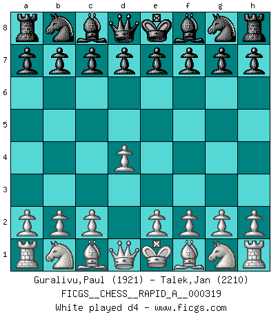 Last move : d4 2026 January 15 10:0:23 White clock - 30 days 15:31:11 Black clock - 29 days 22:28:09 [Event "FICGS__CHESS__RAPID_A__000319"] [Site "FICGS"] [Date "2026.01.15"] [Round "1"] [White "Guralivu,Paul"] [Black "Talek,Jan"] [Result "*"] [WhiteElo "1921"] [BlackElo "2210"] 1.d4 * Follow this game move after move (download)The most important feature of the Chess position is the activity of the pieces. This is absolutely fundamental in all phases of the game: Opening, Middlegame and especially Endgame. The primary constraint on a piece's activity is the Pawn structure. (Michael Stean) Rubinstein ist ein Turmendspiel, welches die Götter vor tausenden von Jahren begannen. (Savielly Grigorievitsch Tartakower) Cuando veas una buena jugada, trata de encontrar otra mejor. (Emanuel Lasker) Il vaut toujours mieux jouer un plan faux de façon logique que de n'avoir pas de plan du tout. (Victor Kortchnoï) There are 10 types of people in this world: those who understand binary and those who don't. (Anonymous)