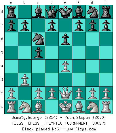 Last move : Qe2 2026 January 16 9:15:57 White clock - 40 days 00:00:00 Black clock - 38 days 21:12:51 [Event "FICGS__CHESS__THEMATIC_TOURNAMENT__000279"] [Site "FICGS"] [Date "2026.01.16"] [Round "1"] [White "Jempty,George"] [Black "Pech,Stepan"] [Result "*"] [WhiteElo "2234"] [BlackElo "2070"] 1.e4 e6 2.Qe2 * Follow this game move after move (download)Openings teach you openings. Endgames teach you chess ! (Stephan Gerzadowicz) Schach ist die gewalttätigste aller Sportarten. (Garry Kasparov) El Ajedrez te enseña a controlarl la excitación inicial que sientes cuando vez algo que parece bueno y te enseña a pensar objetivamente cuando te encuentras en problemas. (Stanley Kubrick) La victoire dans une partie d'Echecs appartient la plupart du temps à celui qui voit un peu plus loin que l'adversaire. (Lasker) Crush them ! Make them suffer ! (General Grievous in Star Wars ep.3)