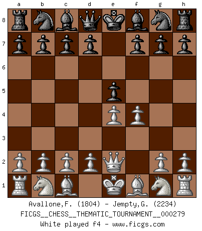 Last move : f4 2026 January 17 11:38:14 White clock - 39 days 01:24:22 Black clock - 39 days 19:45:46 [Event "FICGS__CHESS__THEMATIC_TOURNAMENT__000279"] [Site "FICGS"] [Date "2026.01.16"] [Round "1"] [White "Avallone,Francesca"] [Black "Jempty,George"] [Result "*"] [WhiteElo "1804"] [BlackElo "2234"] 1.e4 e6 2.Qe2 e5 3.f4 * Follow this game move after move (download)The hallmark of the artist is simplicity. (Larry Evans) Nie in meinem Leben habe ich die französische Verteidigung gespielt, welche die Stumpfsinnigste von allen ist. (Wilhelm Steinitz) Me gusta decir que Bobby Fischer fue el mejor jugador que jamás haya existido. Pero lo que hizo de Fischer un genio, fue su habilidad de mezclar una frescura y pragmatismo Americano con ideas Rusas acerca de la estrategia. (Bruce Pandolfini) La vie est comme un jeu d'échecs : nous esquissons un plan, mais celui-ci est tributaire de ce que daignent faire l'adversaire aux échecs et le destin dans la vie. (Arthur Schopenhauer) I don't know, I don't care, and it doesn't make any difference. (Albert Einstein)