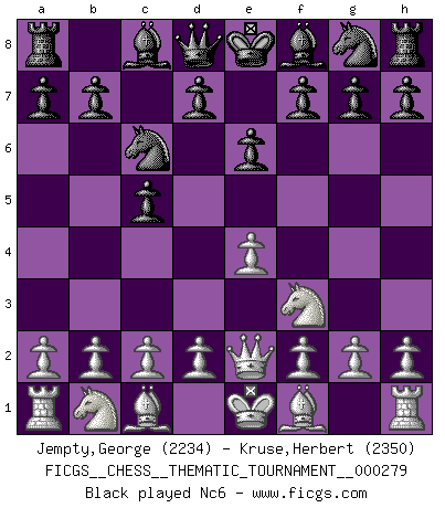Last move : Nc6 2026 January 17 8:14:24 White clock - 38 days 21:33:53 Black clock - 39 days 23:38:10 [Event "FICGS__CHESS__THEMATIC_TOURNAMENT__000279"] [Site "FICGS"] [Date "2026.01.16"] [Round "1"] [White "Jempty,George"] [Black "Kruse,Herbert"] [Result "*"] [WhiteElo "2234"] [BlackElo "2350"] 1.e4 e6 2.Qe2 c5 3.Nf3 Nc6 4.* Follow this game move after move (download)Chess is a fairy tale of 1001 blunders. (Savielly Tartakower) Gegen einen Schachcomputer zu verlieren ist wie Löcher in den Strümpfen zuhaben. Es ist nicht peinlich, solange man der einzige ist der es weiß. (Anonymous) Diferente gente reacciona diferentemente en aceptar la derrota. (Bobby Fischer) Mais n'est-ce pas déjà le limiter injurieusement que d'appeler les échecs un jeu? N'est-ce pas aussi une science, un art, ou quelque chose qui, comme le cercueil de Mahomet entre ciel et terre, est suspendu entre l'un et l'autre, et qui réunit un nombre incroyable de contraires ? (Stefan Zweig) A computer lets you make more mistakes faster than any invention in human history - with the possible exceptions of handguns and tequila. (Mitch Ratcliffe)