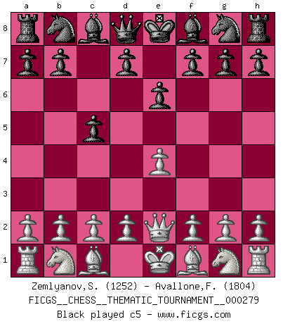 Last move : c5 2026 January 17 11:42:8 White clock - 39 days 23:38:14 Black clock - 38 days 21:33:49 [Event "FICGS__CHESS__THEMATIC_TOURNAMENT__000279"] [Site "FICGS"] [Date "2026.01.16"] [Round "1"] [White "Zemlyanov,Sergey"] [Black "Avallone,Francesca"] [Result "*"] [WhiteElo "1252"] [BlackElo "1804"] 1.e4 e6 2.Qe2 c5 3.* Follow this game move after move (download)Don't even mention losing to me. I can't stand to think of it. (Bobby Fischer) Wenn ich mich einlogge, glauben die Leute gewöhnlich nicht, dass ich es selbst bin und sie fangen an, mir dumme Fragen zu stellen. Und wenn sie es glauben, stellen sie wieder andere dumme Fragen. (Judith Polgar) Creo que una cierta cantidad de temperamento es esperada de los genios del Ajedrez. (Ron Gross) Le profane ne songe pas à la somme de jouissance dont il se prive, qui méconnaît ce jeu aux ressources aussi variées que passionnantes. (Jean-Marie Jeanton-Lamarche) No man has ever achieved immortality in his own life time. (Unknown)