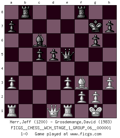 Last move : 1-0 2006 October 19 12:37:55 [Event "FICGS__CHESS__WCH_STAGE_1_GROUP_06__000001"] [Site "FICGS"] [Date "2006.07.01"] [Round "1"] [White "Herr,Jeff"] [Black "Grosdemange,David"] [Result "1-0"] [WhiteElo "1200"] [BlackElo "1983"] 1.d4 Nf6 2.c4 c5 3.d5 b5 4.b3 bxc4 5.bxc4 e6 6.dxe6 fxe6 7.e3 Nc6 8.Nf3 g6 9.Be2 Bg7 10.Bb2 O-O 11.O-O Rb8 12.Bc3 Qc7 13.Nbd2 d6 14.a3 Bd7 15.h3 d5 16.cxd5 exd5 17.Nb3 Qd6 18.Na5 Ne4 19.Bxg7 Kxg7 20.Nxc6 Bxc6 21.Nd2 Qe5 22.Nxe4 Qxe4 23.Bf3 Qe5 24.Re1 1-0 This chess game has been lost on time (started : 2006.07.01 16:7:34) Benko gambit Kingside Castling by player Black (move 10) Kingside Castling by player White (move 11) Player White won this chess game. Follow this game move after move (download)A man without frontiers. He didn't divide the East and the West, he brought them together in their admiration for him. (Ljubomir Ljubojevic, about Bobby Fischer's death) Ich bin es gewohnt, das die Jugend mir überhaupt keinen Respekt entgegenbringt. (Alexander Morozewich) EL Ajedrez es como la vida. (Boris Spassky) J'ai toujours senti une vague pitié pour l'homme qui ne connaît rien aux échecs, tout comme j'en aurais pour un homme ignorant de l'amour. Les Echecs, comme la musique ou comme l'amour, ont le pouvoir de rendre heureux. (Siegbert Tarrasch) Life is like a ten-speed bicycle: most of us have gears we never use. (Charles M. Schulz)