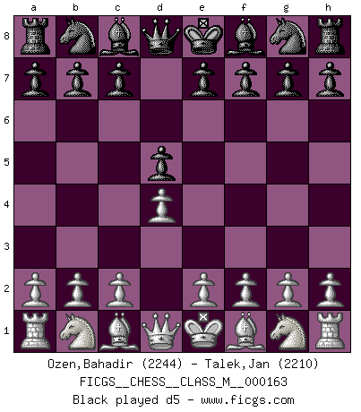 Last move : d5 2026 January 17 7:48:0 White clock - 39 days 09:11:42 Black clock - 39 days 23:55:44 [Event "FICGS__CHESS__CLASS_M__000163"] [Site "FICGS"] [Date "2026.01.16"] [Round "1"] [White "Ozen,Bahadir"] [Black "Talek,Jan"] [Result "*"] [WhiteElo "2244"] [BlackElo "2210"] 1.d4 d5 2.* Follow this game move after move (download)Chess is the art of analysis. (Mikhail Botvinnik) Ein Buch ist ein Spiegel; wenn ein Affe hineinsieht, so kann kein Apostel heraus gucken. (Georg Christoph Lichtenberg) La captura del Rey enemigo es la finalidad pero no el primer objetivo de la partida. (William Steinitz) Les échecs, c'est la lutte contre l'erreur. (Johannes Zukertort) Those who make the worst use of their time are the first to complain of its brevity. (Jean de la Bruyere)
