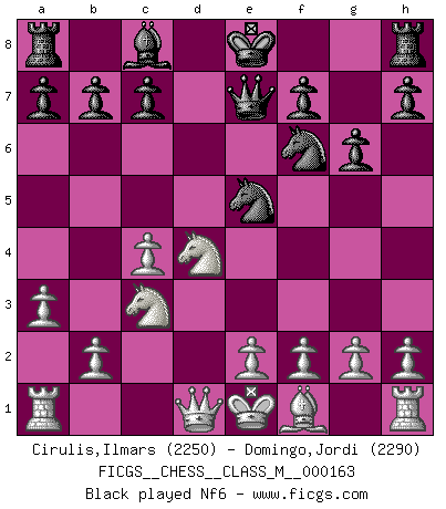 Last move : Bxe7 2026 January 17 9:51:2 White clock - 39 days 18:43:04 Black clock - 39 days 14:20:45 [Event "FICGS__CHESS__CLASS_M__000163"] [Site "FICGS"] [Date "2026.01.16"] [Round "1"] [White "Cirulis,Ilmars"] [Black "Domingo,Jordi"] [Result "*"] [WhiteElo "2250"] [BlackElo "2290"] 1.d4 d5 2.c4 e5 3.dxe5 d4 4.a3 Nc6 5.Nf3 g6 6.Bg5 Be7 7.Bxe7 * Follow this game move after move (download)Chess is a fighting game which is purely intellectual and includes chance. (Richard Reti) Das Spiel gibt uns die Genugtuung, die das Leben uns versagt. (Emanuel Lasker) Muchos jugadores de Ajedrez se sorprendían cuando después de la partida, Fischer explicaba con calma: 'Yo ya había analizado esta posibilidad' en una posición en la cual yo creía que no era posible de prever desde la apertura. (Mikhail Tal) Le système Elo représente seulement une moyenne. Il est simplement un indicateur de votre stabilité. (Anatoli Karpov) Perhaps the current trend of many chess professionals taking up the more lucrative pastime of poker is not a wholly negative one. It may not be too late for humans to relearn how to take risks in order to innovate and thereby maintain the advanced lifestyles we enjoy. And if it takes a poker-playing supercomputer to remind us that we can't enjoy the rewards without taking the risks, so be it. (The Chess Master and the Computer, by Garry Kasparov - 2010)