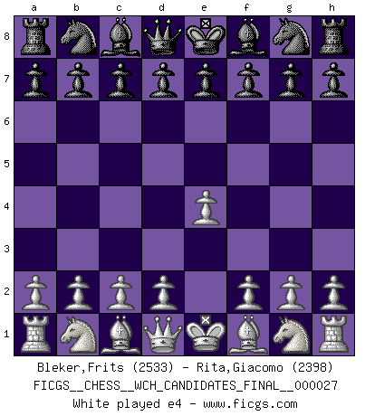 Last move : e4 2026 January 27 18:4:49 White clock - 30 days 18:38:58 Black clock - 29 days 18:05:17 [Event "FICGS__CHESS__WCH_CANDIDATES_FINAL__000027"] [Site "FICGS"] [Date "2026.01.27"] [Round "5"] [White "Bleker,Frits"] [Black "Rita,Giacomo"] [Result "*"] [WhiteElo "2533"] [BlackElo "2398"] 1.e4 * Follow this game move after move (download)It is peculiar but a fact nevertheless, that gamblers in chess always have enthusiastic followers. (Botvinnik) Ich verachte Kasparow. (Viktor Kortschnoi) Un Peón pasado es un criminal, quién debe ser mantenido bajo candado y llave. Leves medidas, tales como vigilancia policiaca, no son suficientes. (Aaron Nimzovich) Fischer est le meilleur joueur du monde et Karpov n'est qu'un joueur de bistrot. (Garry Kasparov, agé de 16 ans) The Internet is the world's largest library. It's just that all the books are on the floor. (John Allen Paulos)