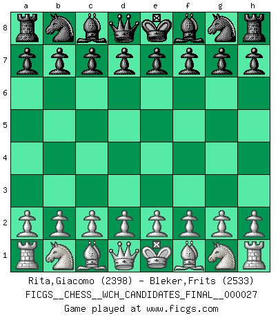 First move 2026 January 27 12:43:47 White clock - 29 days 12:44:22 Black clock - 30 days 00:00:00 [Event "FICGS__CHESS__WCH_CANDIDATES_FINAL__000027"] [Site "FICGS"] [Date "2026.01.27"] [Round "6"] [White "Rita,Giacomo"] [Black "Bleker,Frits"] [Result "*"] [WhiteElo "2398"] [BlackElo "2533"] 1.* Follow this game move after move (download)Fischer Chess play was always razor-sharp, rational and brilliant. One of the best ever. (Dave Regis) Mit Schach schule ich mein Gefühl für Geometrie, was für Tennis und Schach gleichermaßen wichtig ist. (Boris Becker) Cuando le juegas a Fischer, no es una cuestion de si vas a ganar o perder. Es una cuestion de si vas a sobrevivir. (Boris Spassky) Avec des compensations pour le matériel en plus... (Anonyme) If you don't practice you don't deserve to win. (Andre Agassi)