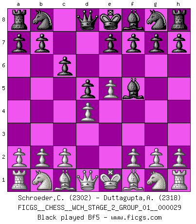 Last move : Bf5 2026 January 27 16:51:9 White clock - 32 days 21:33:46 Black clock - 32 days 22:22:11 [Event "FICGS__CHESS__WCH_STAGE_2_GROUP_01__000029"] [Site "FICGS"] [Date "2026.01.27"] [Round "1"] [White "Schroeder,Christoph"] [Black "Duttagupta,Aniruddha"] [Result "*"] [WhiteElo "2302"] [BlackElo "2318"] 1.e4 c6 2.d4 d5 3.e5 Bf5 4.* Follow this game move after move (download)The most powerful weapon in Chess is to have the next move. (David Bronstein) Es tut gut, die Entwicklungsperiode von, [...] demokratischem Geist durchdringen zu lassen. Wie undemokratisch wäre es doch beispielsweise, den einen Offizier große Spaziertouren vornehmen zu lassen, während die anderen zu Hause säßen und sich entsetzlich langweilten. (Aaron Nimzowitsch) La vida es como el Ajedrez, con lucha, competición y eventos buenos y malos. (Benjamin Franklin) Vous m'avez demandé de vous exposer quel est le fondement de la prière. Je ne fais que préparer les pièces du jeu sur la table... Nous sera-t-il permis d'en adopter les règles et si nous les appliquons scrupuleusement nous ne tarderons pas à faire mat le Roi divin ! Il ne pourra échapper à nos mains. (Sainte Thérèse d'Avila, Chemin de perfection) Now you put water in a cup, it becomes the cup; You put water into a bottle it becomes the bottle; You put it in a teapot it becomes the teapot. Water can flow or it can crash. Be water, my friend. (Bruce Lee)
