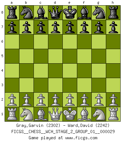 First move 2026 January 27 14:13:3 White clock - 29 days 13:30:13 Black clock - 30 days 00:00:00 [Event "FICGS__CHESS__WCH_STAGE_2_GROUP_01__000029"] [Site "FICGS"] [Date "2026.01.27"] [Round "1"] [White "Gray,Garvin"] [Black "Ward,David"] [Result "*"] [WhiteElo "2302"] [BlackElo "2242"] 1.* Follow this game move after move (download)In Chess, at least, the brave inherit the earth. (Edmar Mednis) Ein bischen Romantik kann weder im Schach noch in der Liebe schaden. Also versuche ich mich ab und zu daran zu erinnern. (Nigel Short) El Ajedrez era la lengua materna de Capablanca. (Reti) Les Echecs représentent une sphère d'idées créatrices basée sur la volonté des deux protagonistes. (Smyslov) Luck never gives; it only lends. (Swedish proverb)