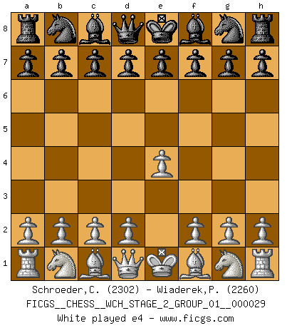 Last move : e4 2026 January 27 14:45:4 White clock - 30 days 23:27:59 Black clock - 29 days 15:20:30 [Event "FICGS__CHESS__WCH_STAGE_2_GROUP_01__000029"] [Site "FICGS"] [Date "2026.01.27"] [Round "1"] [White "Schroeder,Christoph"] [Black "Wiaderek,Piotr"] [Result "*"] [WhiteElo "2302"] [BlackElo "2260"] 1.e4 * Follow this game move after move (download)Bobby Fischer is the greatest Chess player who has ever lived. (Ken Smith) Ich würde mich als ganz normalen Jungen bezeichnen [Im Alter von 12]. (Sergej Karjakin) ¿Quién es tu oponente esta tarde? Esta tarde mi oponente son las piezas negras. (Akiba Rubinstein) Les Cavaliers se révèlent fort utiles dans les positions fermées. D'habitude, les Fous sont un peu plus forts que les Cavaliers dans les positions ouvertes. Qu'on le veuille ou non, il restera toujours des exceptions ! Luck has a peculiar habit of favoring those who don't depend on it. (Author unknown)