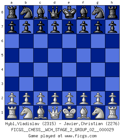 First move 2026 January 27 14:13:0 White clock - 29 days 16:20:33 Black clock - 30 days 00:00:00 [Event "FICGS__CHESS__WCH_STAGE_2_GROUP_02__000029"] [Site "FICGS"] [Date "2026.01.27"] [Round "1"] [White "Hybl,Vladislav"] [Black "Javier,Christian"] [Result "*"] [WhiteElo "2315"] [BlackElo "2276"] 1.* Follow this game move after move (download)Good positions don't win games, good moves do. (Gerald Abrahams) Wie ich sie so einen nach dem anderen nieder mähte wurde meine Überlegenheit offensichtlich. (José Raúl Capablanca) Cuando tu no sabes absolutamente que mas hacer, es tiempo de entrar en pánico. (John van der Wiel) On a dit que l'homme se distingue de l'animal par le fait qu'il achète plus de livres qu'il ne peut en lire. Je voudrais suggérer qu'inclure à la liste des livres quelques livres d'échecs rendrait la distinction manifeste. (Edward Lasker) To steal ideas from one person is plagiarism. To steal from many is research. (Unknown)