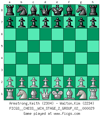 First move 2026 January 27 14:13:0 White clock - 29 days 19:18:40 Black clock - 30 days 00:00:00 [Event "FICGS__CHESS__WCH_STAGE_2_GROUP_02__000029"] [Site "FICGS"] [Date "2026.01.27"] [Round "1"] [White "Armstrong,Keith"] [Black "Walton,Kim"] [Result "*"] [WhiteElo "2304"] [BlackElo "2234"] 1.* Follow this game move after move (download)My style is somewhere between that of Tal and Petrosian. (Reshevsky) Ein Großmeister muß tausende Partien in seinem Kopf speichern, denn diese sind für Ihn, was die Worte der Muttersprache für gewöhnliche Leute sind, oder Noten für Musiker... (Garry Kasparov) El Ajedrez es un expediente tonto que hace creer a la gente inactiva que hacen una cosa muy astuta cuando solamente estan perdiendo su tiempo. (George Bernard Shaw) Mon pion favori sur ma case favorite ! Bronstein en parlant d'un coup de pion en h5 quand il avait les Noirs. A journey of a thousand sites begins with a single click. (Author unknown)
