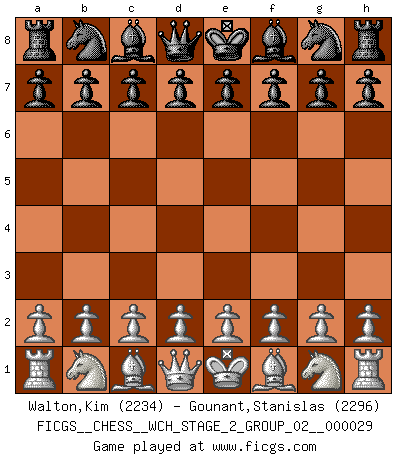 First move 2026 January 27 14:13:0 White clock - 29 days 16:20:30 Black clock - 30 days 00:00:00 [Event "FICGS__CHESS__WCH_STAGE_2_GROUP_02__000029"] [Site "FICGS"] [Date "2026.01.27"] [Round "1"] [White "Walton,Kim"] [Black "Gounant,Stanislas"] [Result "*"] [WhiteElo "2234"] [BlackElo "2296"] 1.* Follow this game move after move (download)Fischer prefers to enter Chess history alone. (Miguel Najdorf) Sicherlich können nur Meister einen Stil haben. Daß ein nicht-Meister auch nur ein einziges Mal in seinem Leben eine Partie folgerecht durchführte, habe ich niemals bemerkt. (Emanuel Lasker) Ciertamente, de todas la drogas del mundo, el Ajedrez debe ser el mas placentero permamentemente. (Assiac) Roi des jeux et jeu des rois, les échecs portent en eux un sentiment d'infini. Ils donnent à celui qui s'est efforcé d'en approfondir les arcanes l'impression de n'être pas à la mesure de l'homme; en fait, ils constituent un résumé de l'univers, un microcosme, et figurent cette grande échelle qui, dans les plans de la lumière descend jusqu'à la matière, qui des abîmes insondables remonte jusqu'en l'infini de Dieu. (Pyrame) If you work for a living, why do you kill yourself working ? (Tuco to a chicken in The Good, The Bad and The Ugly)