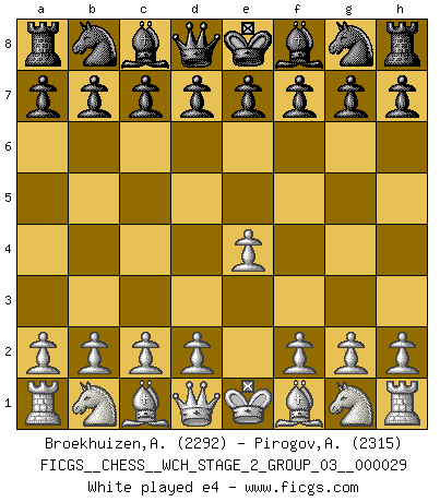 Last move : e4 2026 January 27 18:15:17 White clock - 30 days 19:57:45 Black clock - 29 days 15:53:19 [Event "FICGS__CHESS__WCH_STAGE_2_GROUP_03__000029"] [Site "FICGS"] [Date "2026.01.27"] [Round "1"] [White "Broekhuizen,A. T. S."] [Black "Pirogov,Andrey Mikhaylovich"] [Result "*"] [WhiteElo "2292"] [BlackElo "2315"] 1.e4 * Follow this game move after move (download)I like to say that Bobby Fischer was the greatest player ever. But what made Fischer a genius was his ability to blend an American freshness and pragmatism with Russian ideas about strategy. (Bruce Pandolfini) Vom Schach wurde gesagt das Leben sei dafür nicht lange genug. Aber das ist der Fehler des Lebens, nicht des Schach'. (Irving Chernev) Aquellos que dicen entender al Ajedrez, no entienden nada. (Robert Hubner) Le moment que je préfère le plus dans une rencontre, c'est celui où je sens que la personnalité de l'adversaire se brise. (Robert Fischer) Programming can only do so much before it becomes too much. (Don Groves)