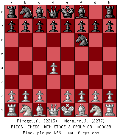 Last move : Nf6 2026 January 28 1:0:33 White clock - 30 days 18:11:34 Black clock - 30 days 16:21:42 [Event "FICGS__CHESS__WCH_STAGE_2_GROUP_03__000029"] [Site "FICGS"] [Date "2026.01.27"] [Round "1"] [White "Pirogov,Andrey Mikhaylovich"] [Black "Moreira,Jose"] [Result "*"] [WhiteElo "2315"] [BlackElo "2277"] 1.d4 Nf6 2.* Follow this game move after move (download)I love all positions. Give me a difficult positional game, I will play it. But totally won positions, I cannot stand them. (Hein Donner) Ich trinke, ich rauche, ich spiele, ich liebe Frauen aber Fernschach ist ein Laster, das ich nicht habe. (Mikhail Nekhemyevich Tal) ¿Quién es tu oponente esta tarde? Esta tarde mi oponente son las piezas negras. (Akiba Rubinstein) Les échecs c'est le défi de l'alpiniste, toujours plus haut, prêt à tout pour monter à l'assaut du Roi ennemi. Les échecs, c'est de la musique en mouvement, un ballet majestueux pour les yeux. C'est de la poésie composée par les fantômes du passé qui au même titre que Rimbaud ou Verlaine méritent notre admiration. Les échecs, c'est de la peinture ou le moindre mouvement modifie le tableau pour en faire un Picasso ou un Van Gogh. Les échecs, c'est tout et rien, c'est la vie et la mort. Jjulie33 sur le forum de France-Echecs. If computers get too powerful, we can organize them into committees. That'll do them in. (Anonymous)