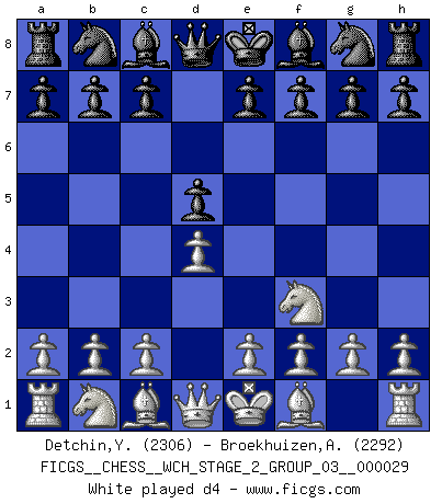 Last move : d4 2026 January 28 1:45:6 White clock - 31 days 14:55:16 Black clock - 30 days 16:12:45 [Event "FICGS__CHESS__WCH_STAGE_2_GROUP_03__000029"] [Site "FICGS"] [Date "2026.01.27"] [Round "1"] [White "Detchin,Yra"] [Black "Broekhuizen,A. T. S."] [Result "*"] [WhiteElo "2306"] [BlackElo "2292"] 1.Nf3 d5 2.d4 * Follow this game move after move (download)A man without frontiers. He didn't divide the East and the West, he brought them together in their admiration for him. (Ljubomir Ljubojevic, about Bobby Fischer's death) In Buenos Aires ist es nicht mein vorrangiges Ziel ein starkes Turnier zu organisieren, sondern ein Turnier für Gentlemen. Ich würde nie Kamsky einladen. Ich mag keine Probleme. (Miguel Najdorf) La maestría del Ajedrez consiste esencialmente en analizar posiciónes de Ajedrez con precisión. (Mikhail Botvinnik) Karpov est une pièce de musée. (Garry Kasparov) At work, the authority of a person is inversely proportional to the number of pens that person is carrying. (Dan Rotaru)