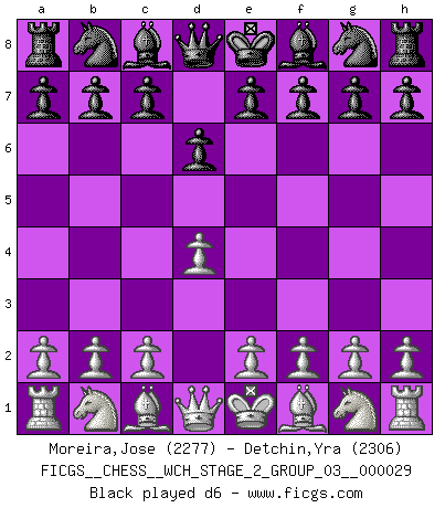 Last move : d6 2026 January 28 2:21:57 White clock - 30 days 06:51:39 Black clock - 30 days 22:38:40 [Event "FICGS__CHESS__WCH_STAGE_2_GROUP_03__000029"] [Site "FICGS"] [Date "2026.01.27"] [Round "1"] [White "Moreira,Jose"] [Black "Detchin,Yra"] [Result "*"] [WhiteElo "2277"] [BlackElo "2306"] 1.d4 d6 2.* Follow this game move after move (download)When you don't know what to play, wait for an idea to come into your opponent's mind. You may be sure that idea will be wrong. (Siegbert Tarrasch) Der Verteidiger gebe der Gewalt nach, aber nur der Gewalt. Er schaffe sich nicht freiwillig, etwa aus Blindheit oder aus Schrecken, irgendwelche Schwächen. Er lasse sich nicht bluffen. (Emanuel Lasker) Hasta este punto, las blancas han seguido un análisis bien conocido. Pero ahora el hace un error fatal: empieza a usar su propia cabeza. (Siegbert Tarrasch) Le pion, dans sa simplicité, marche droit devant lui, mais lorsqu'il prend, il le fait obliquement? Ainsi l'homme, tant qu'il reste pauvre, marche dans la droiture et vit honnêtement, mais lorsqu'il recherche les honneurs, il flatte, se parjure et, par les voies obliques, cherche une position supérieure sur l'échiquier du monde. (Jean de Galles) Everybody lies. (Gregory House, House M.D.)